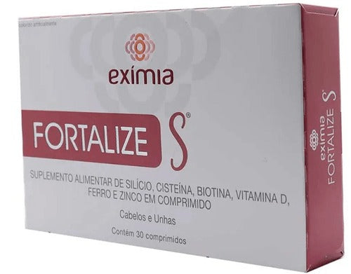 Eximia Fortalize S com 30 comprimidos é um suplemento alimentar que contém Cisteína, Biotina, Vitamina D, Ferro e Zinco, que juntos ajudam no fortalecimento de cabelos e unhas, auxiliando também em um crescimento forte e saudável.