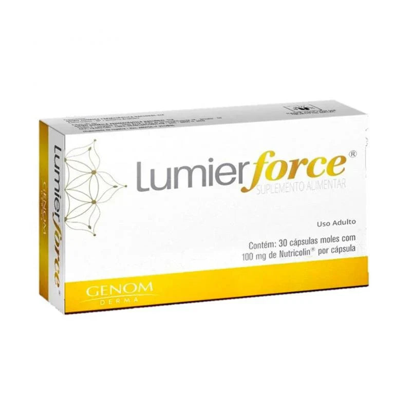 Lumier Force 30 Cápsulas: Lumier Force é um suplemento Alimentar à base de vitaminas, minerais, ômega 3 e silício orgânico (Nutricolin) para a manutenção e recuperação da saúde capilar proporcionando uma melhora na qualidade da fibra capilar e a resistência a quebra das unhas, e produzido pela Genom.
